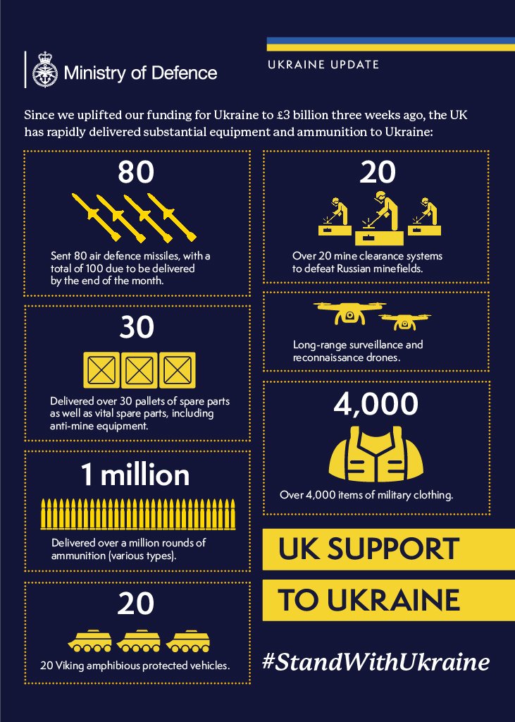 Окрім того, Британія передає Україні 1 мільйон боєприпасів різних типів, 4 тисячі предметів військової амуніції, а також 20 захищених амфібій Viking.