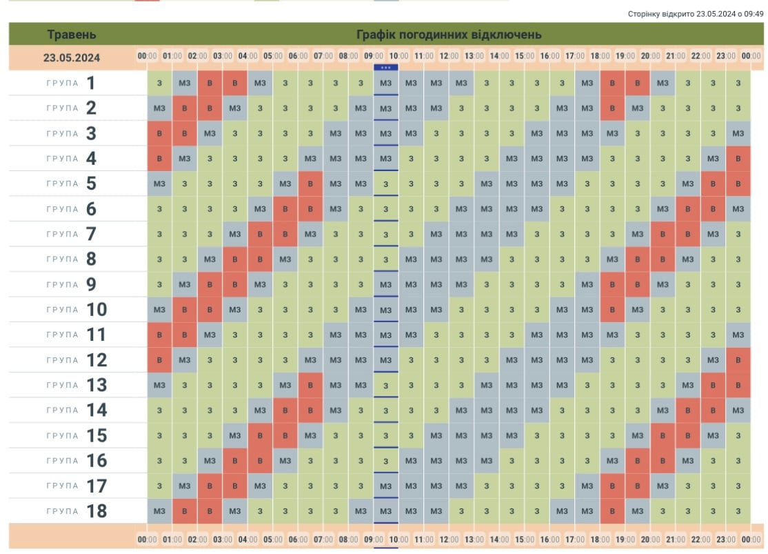 Клітинки сірого кольору в графіку — це час, коли кожна група може бути заживлена або відключена від електропостачання, залежно від змін у лімітах споживання або зменшенню споживанню електроенергії.