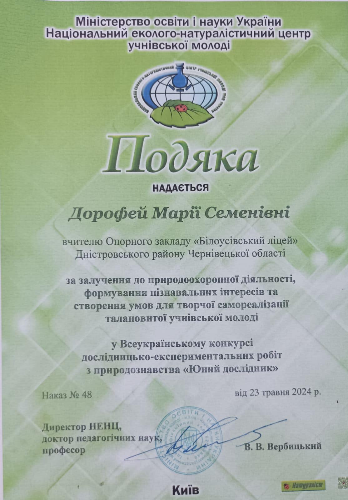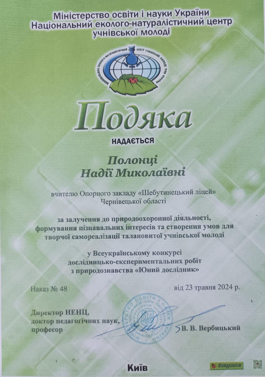 Подяками Національного еколого-натуралістичного центру учнівської молоді Міністерства освіти і науки України нагороджено керівників за залучення до природоохоронної діяльності, формування пізнавальних інтересів та створення умов для творчої самореалізації талановитої учнівської молоді.