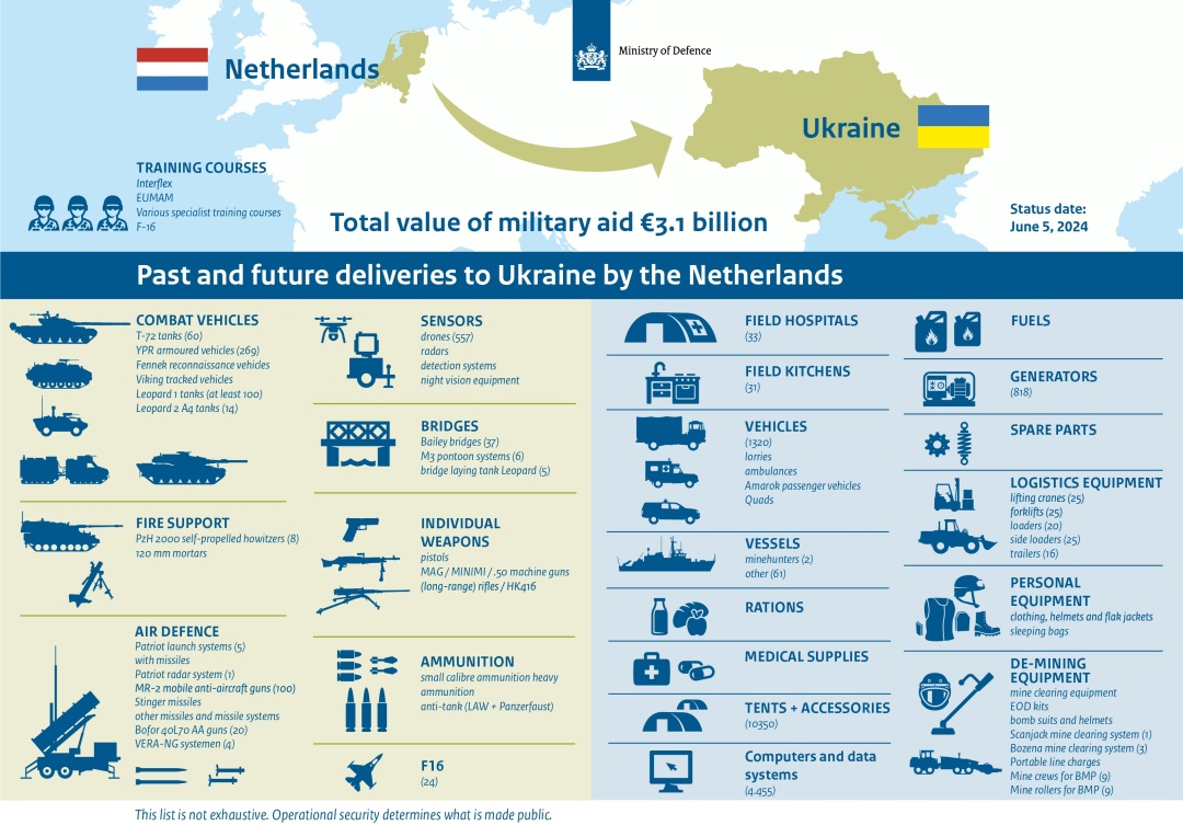Окрім того, Нідерланди направили допомогу Україні із власних запасів на €35 мільйонів і внесли €25 мільйонів до Міжнародного фонду для України. Крім того, цього місяця було оголошено, що Нідерланди інвестують €400 мільйонів у виробництво БМП CV90 Panther для України спільно із Данією та Швецією.