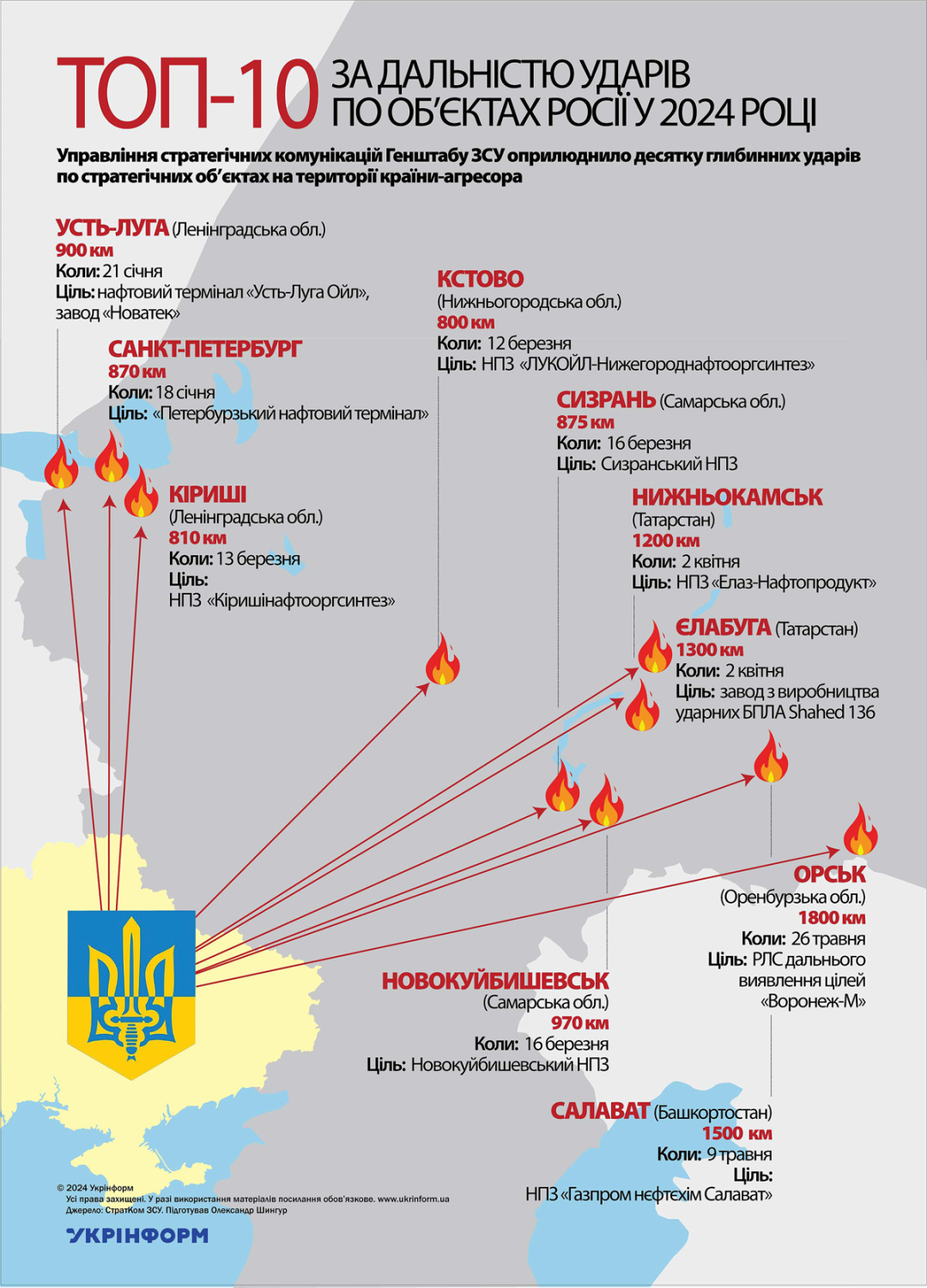 09.07/ ІНФОГРАФІКА/ Десять рекордних за дальністю ударів по об'єктах Росії у 2024 році