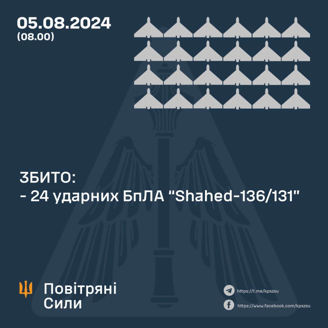 В ніч на понеділок, 5 серпня, Сили протиповітряної оборони України знищили 24 російських ударних безпілотники типу Shahed в семи областях України.