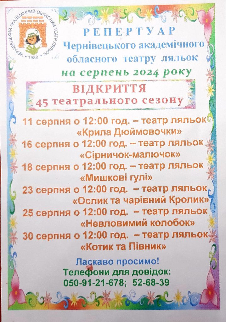 Також у серпні в репертуарі театру заплановані вистави: «Сірничок-малючок», «Мишкові гулі», «Ослик та чарівний Кролик», «Невловимий Колобок» та «Котик та Півник».
