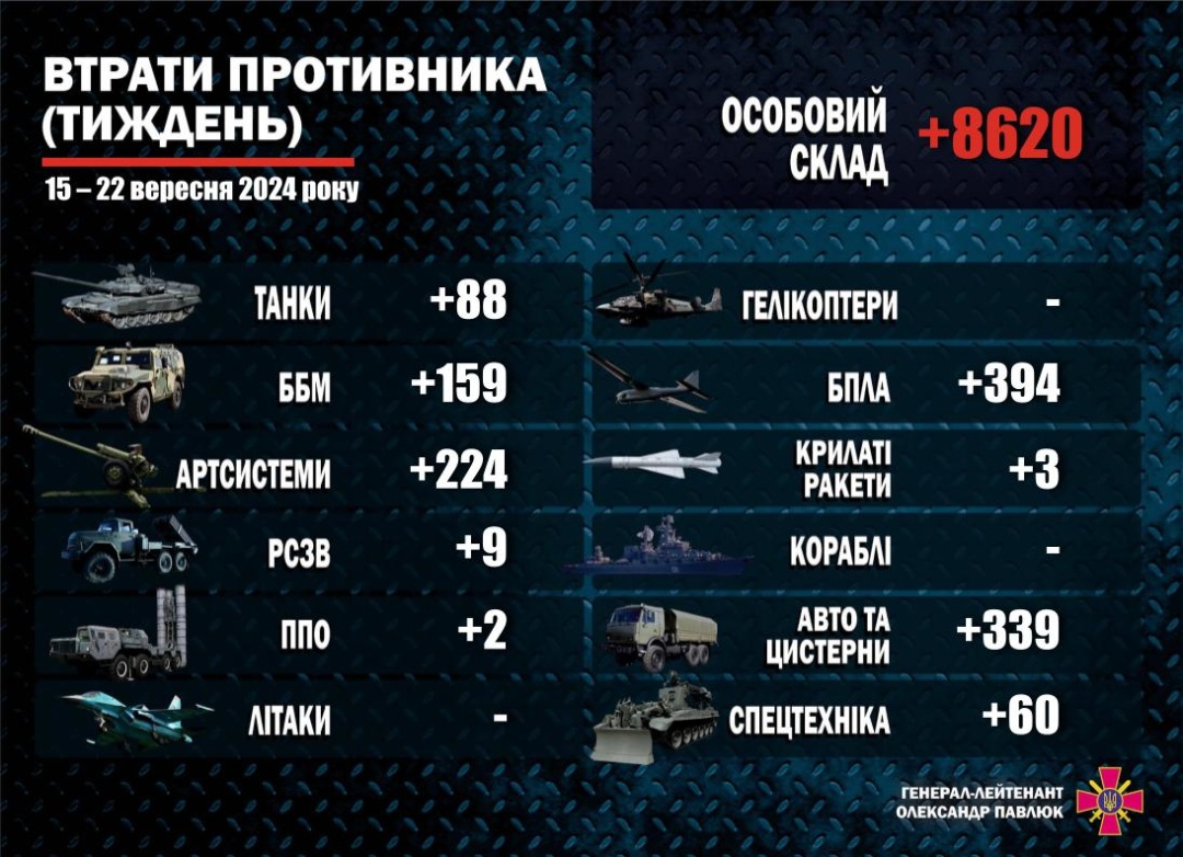 "За тиждень з 15 по 22 вересня 2024 року втрати противника склали близько 8620 осіб особового складу", – йдеться у повідомленні.