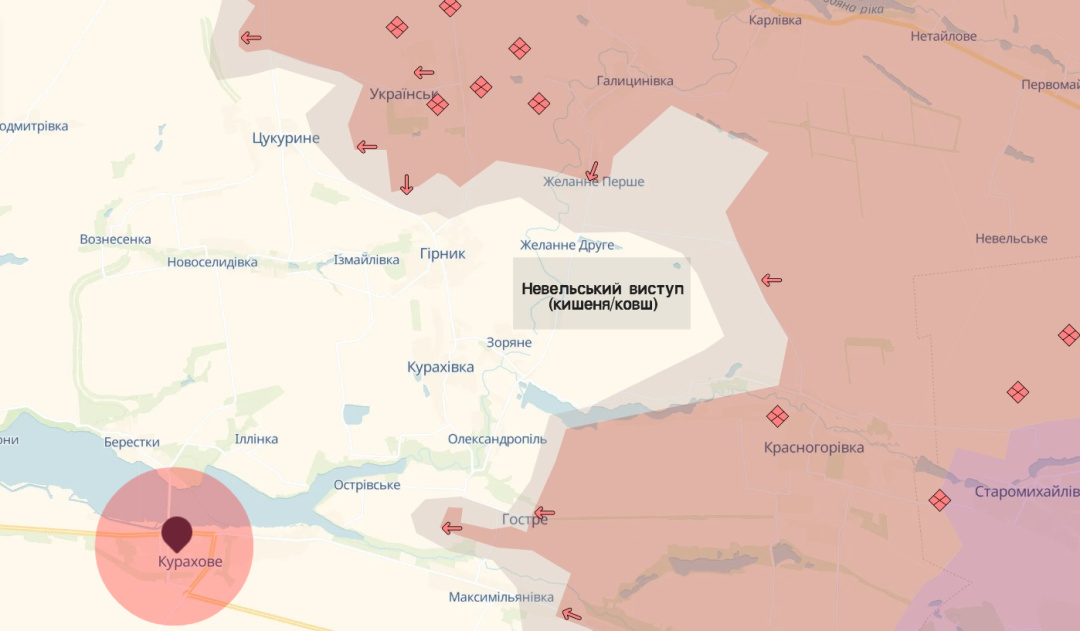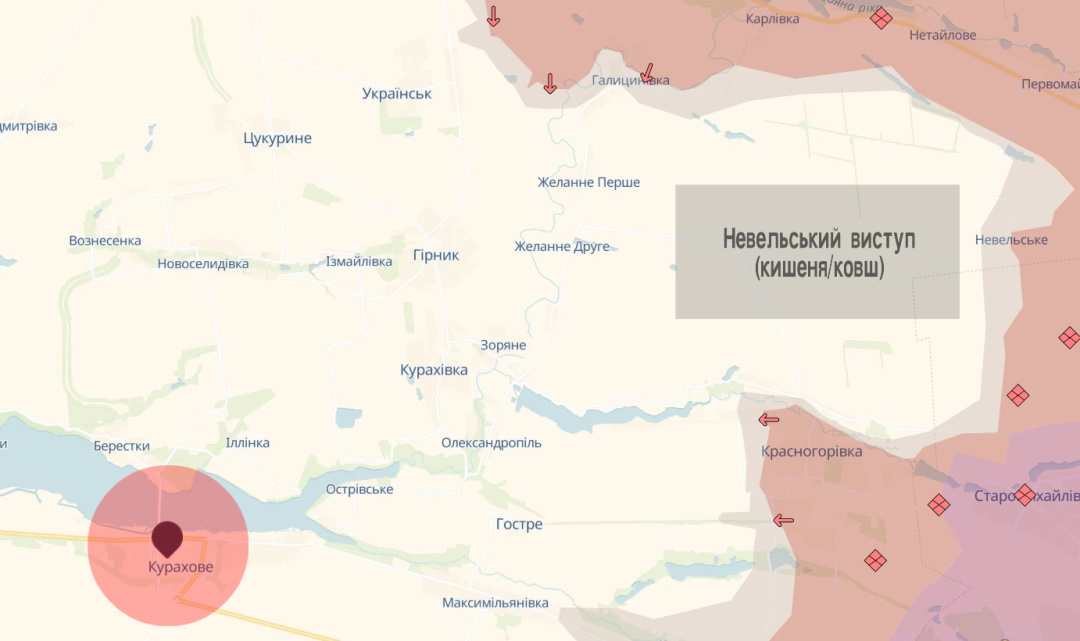 «Де найгірше, найважче? Певно, все там же – на південь від Покровська. Наш Невельський виступ («Невельський ковш», як передчасно назвали його зетблогери ще тиждень тому) продовжує, з ар’єргардними боями, «всихати» – «котла» не сталося. Втім, рашисти крок за кроком витісняють наших оборонців з плацдарму на східному березі Вовчої між Гірником і Курахівкою: наступають з півночі на південь вздовж річки на Желанне Перше в напрямку на Желанне Друге, західніше орки вийшли на північну околицю Гірника. В купі з проривом від Красногорівки до Гострого з загальною дирекцією до східного берега Курахівського водосховища – загроза оточення повністю не знята», – коментує Павло Лакійчук.
