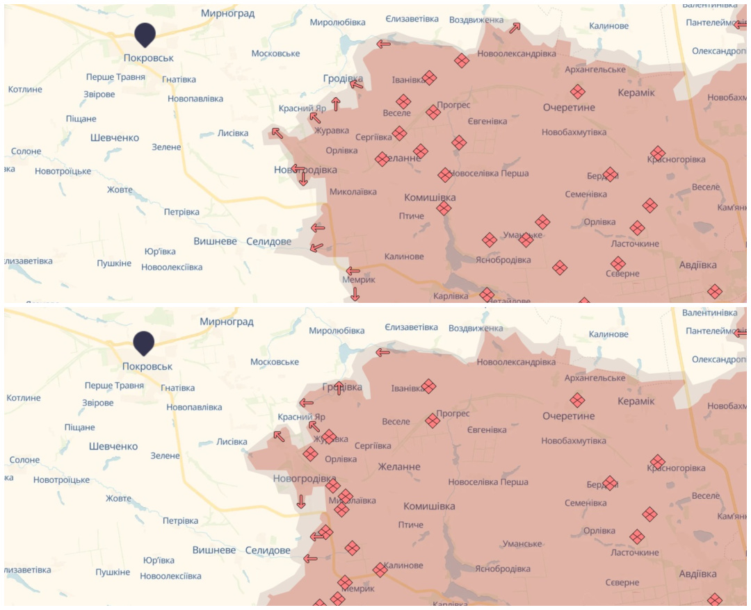 Знову ж таки почнемо з карт: вгорі – ситуація на Покровському напрямку станом на 1 вересня, внизу – на 24 вересня: