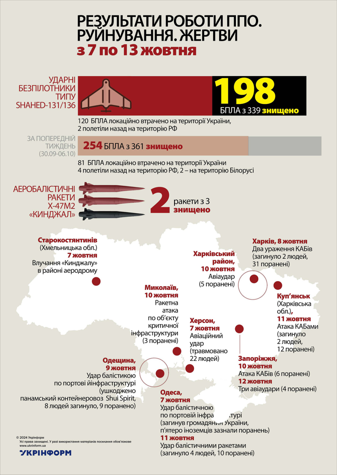 Внаслідок обстрілів російськими окупантами з 07.10 по 13.10 Донецької, Херсонської, Запорізької, Сумської, Дніпропетровської та Харківської областей 17 людей загинули, 121 отримали поранення.