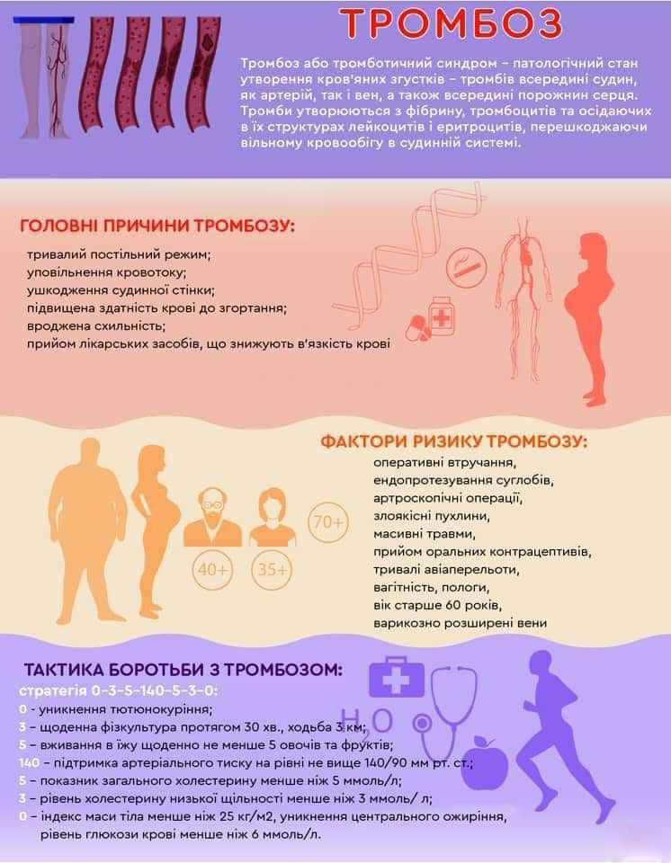 Факторами ризику тромбозу є також оперативні втручання, ендопротезування суглобів, артроскопічні операції, злоякісні пухлини, масивні травми, прийом оральних контрацептивів, тривалі авіаперельоти, вагітність, пологи, вік старше 60 років, варикозно розширені вени.