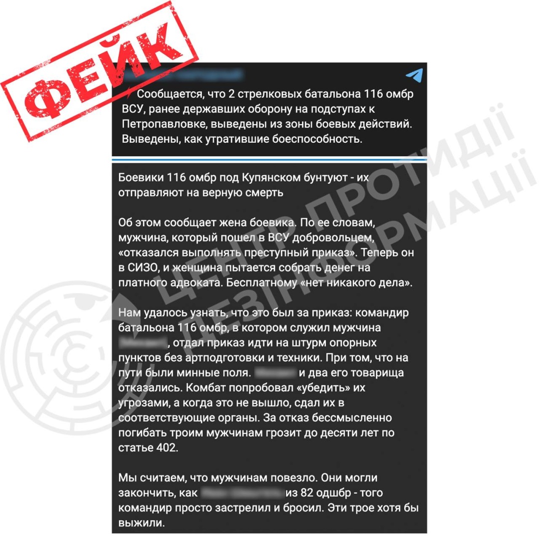 У Центрі протидії дезінформації РНБО України назвали фейком інформацію, яку поширюють російські пропагандисти, про нібито бунт у 116-й окремій механізованій бригаді ЗСУ під Куп’янськом та її виведення із зони бойових дій через втрату боєздатності.