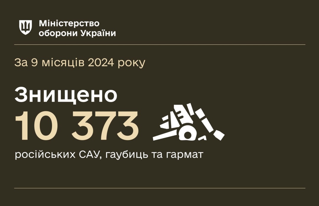 З 1 січня по 1 жовтня 2024 року Збройні сили України знищили 10 373 артилерійські системи російських загарбників.