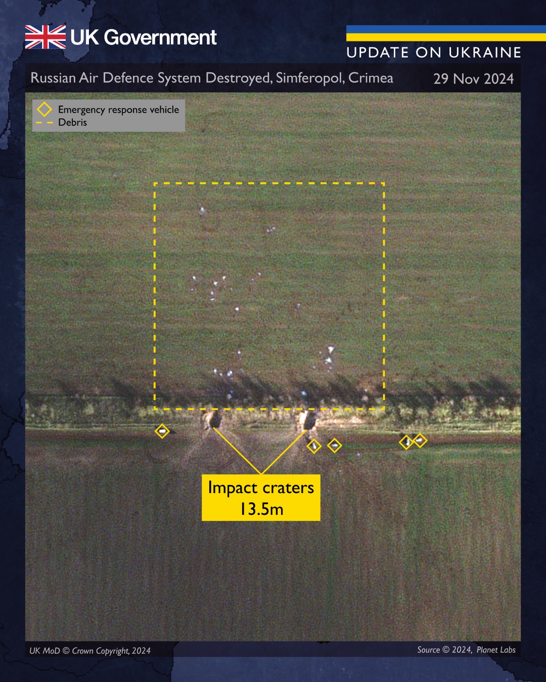 «На знімках було ідентифіковано дві вирви розміром 13,5 м, розсіяні уламки та п’ять автомобілів екстрених служб», – додали у міністерстві.