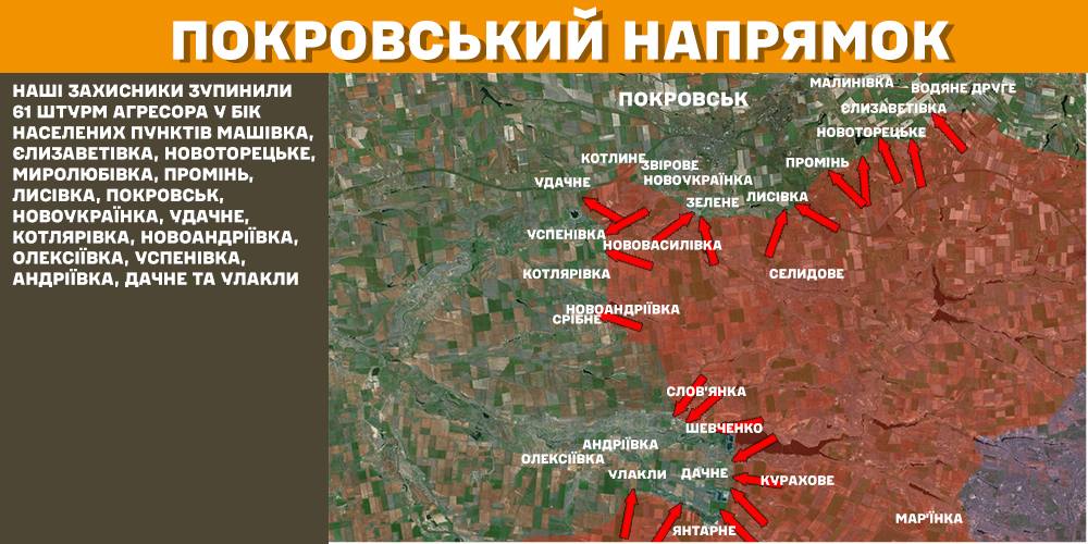 На Покровському напрямку українські захисники зупинили 61 штурм російських військ у бік населених пунктів Машівка, Єлизаветівка, Новоторецьке, Миролюбівка, Промінь, Лисівка, Покровськ, Новоукраїнка, Удачне, Котлярівка, Новоандріївка, Олексіївка, Успенівка, Андріївка, Дачне та Улакли.