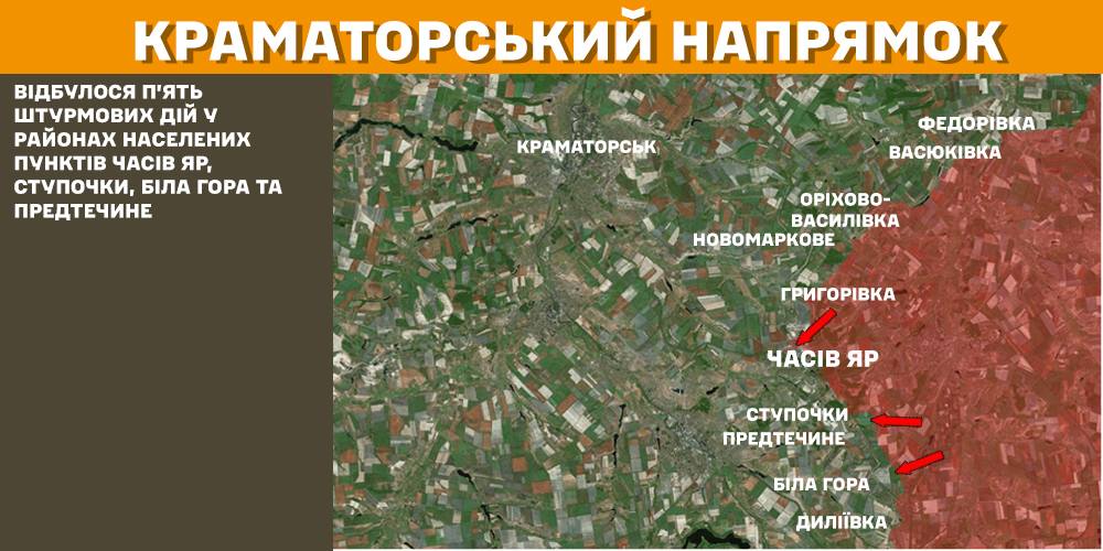 На Краматорському напрямку сталися п’ять штурмових дій у районах Часового Яру, Ступочок, Білої Гори і Предтечиного.