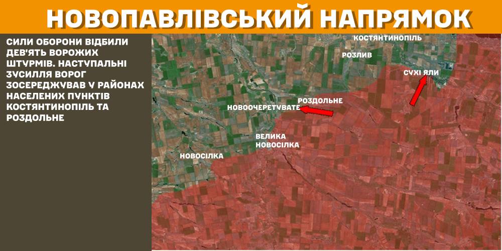 На Новопавлівському напрямку Сили оборони відбили дев’ять ворожих штурмів. Наступальні зусилля війська РФ зосереджували у районах Костянтинополя і Роздольного.