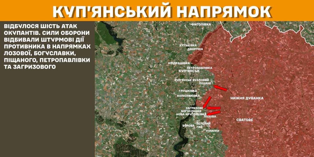 На Куп’янському напрямку зафіксовані шість атак ворога. Сили оборони відбивали штурмові дії в напрямках Лозової, Богуславки, Піщаного, Петропавлівки і Загризового.