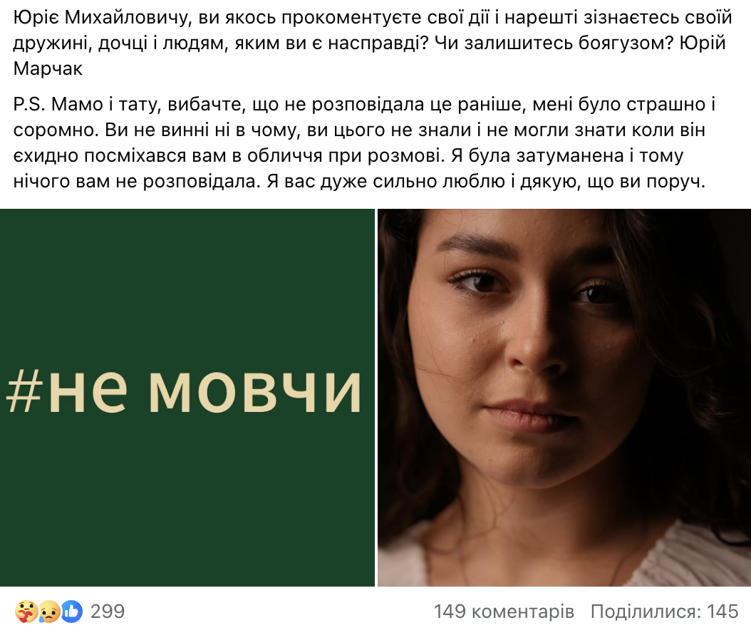 «Згодом усе зайшло ще далі — він почав розпускати руки, торкаючись під білизною як грудей, так і геніталій. Вириватися чи говорити «ні» не допомагало — він просто не чув цих слів. Зараз у всіх виникає таке запитання: “І як ти можеш це розповісти? Тобі не повірять, бо це ж Юрій Марчак — порядна людина, як усі вважають”. Мої батьки дізналися про це саме після прочитання мого допису у фейсбуку. Вони були шоковані та налякані», — каже Катерина.