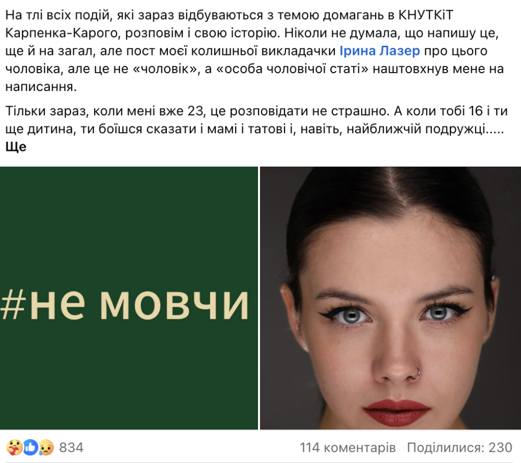 Після допису Катерини інші дівчата, які зазнали домагань від Марчака, також поділилися своїми історіями. Яна Івасюк так само мріяла після школи вступити до університету Карпенка-Карого. Вона теж проходила підготовку у Юрія Марчака.