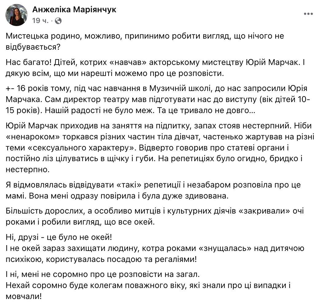 «Він постійно торкався дітей за плечі, груди, стегна, ноги, виправдовуючи це репетиційним процесом і театральною специфікою. Але це було ненормально, огидно й нестерпно. Я одразу сказала мамі, що більше не буду відвідувати заняття з Марчаком, бо почувалася вкрай некомфортно. Найбільше мені запам’ятався його жахливий вислів на мою адресу «не шльопай губами», де він мав на увазі зовсім не губи на обличчі. На той момент мені було всього 11-12 років. Після цього я остаточно відмовилася від занять із ним», — каже Анжеліка Маріянчук.