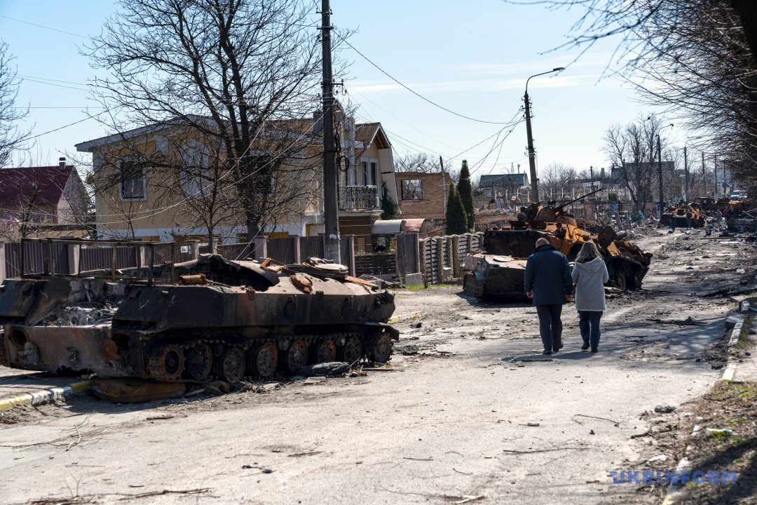Знищена військова техніка росіян на одній з вулиць деокупованого міста Буча, Київська область, 7 квітня 2022 року. Фото: Ганна Войтенко (Укрінформ)