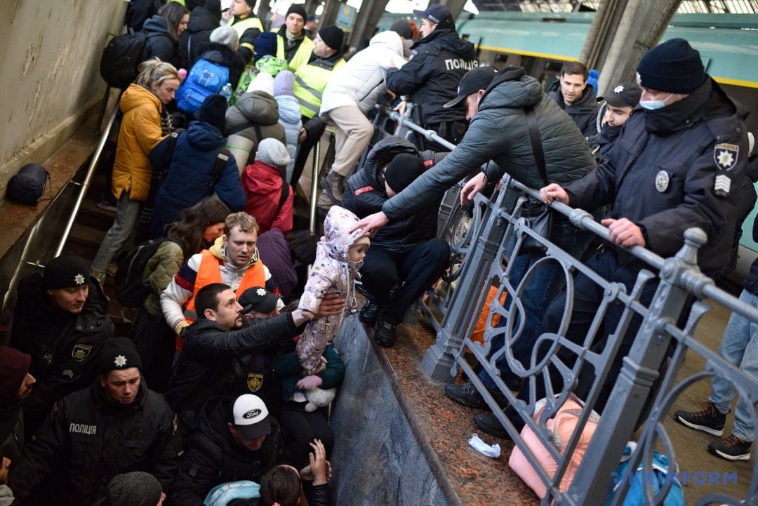 Люди на залізничному вокзалі чекають на евакуаційні поїзди до Польщі, Львів, березень 2022 року. Фото: Маркіян Лисейко (Укрінформ)