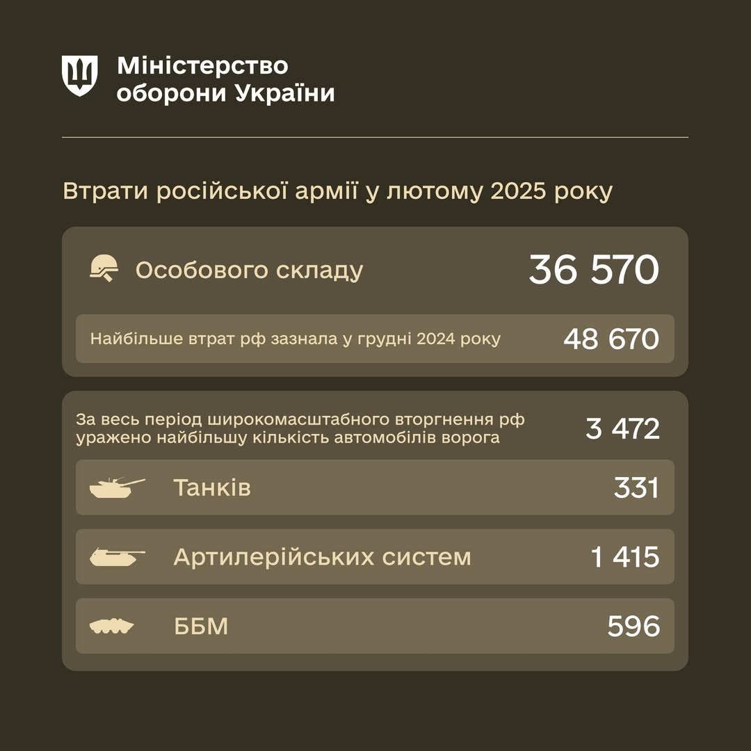 У лютому армія РФ зазнала значних безповоротних і санітарних втрат живої сили – 36 570 осіб. Умовно – це чисельність трьох мотострілецьких дивізій. Найбільше втрат було лише в грудні 2024 року – 48 670 убитими та пораненими.