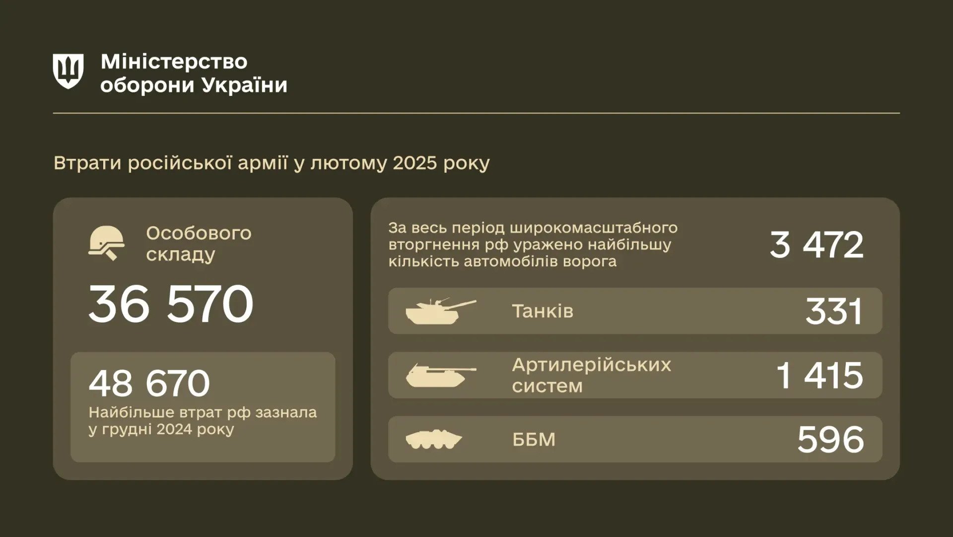 За інформацією Генерального штабу ЗСУ, в лютому армія рф зазнала значних безповоротних і санітарних втрат живої сили – 36 570 осіб. Найбільше втрат особового складу армія РФ  зазнавала у грудні 2024 року – 48 670.