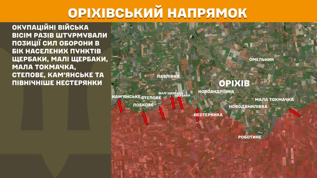 На Оріхівському напрямку російська армія вісім разів штурмувала позиції Сил оборони в бік Щербаків, Малих Щербаків, Малої Токмачки, Степового, Кам’янського і північніше Нестерянки.