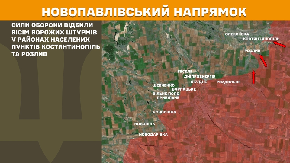 На Новопавлівському напрямку Сили оборони відбили вісім ворожих штурмів у районах населених пунктів Костянтинопіль та Розлив.