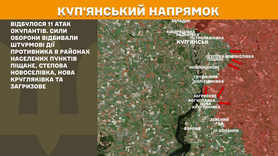 На Куп’янському напрямку за минулу добу відбулося 11 атак окупантів. Сили оборони відбивали штурмові дії противника в районах населених пунктів Піщане, Степова Новоселівка, Нова Кругляківка та Загризове.
