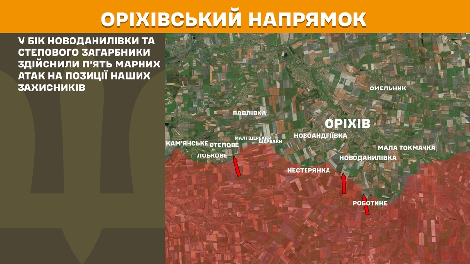 На Оріхівському напрямку у бік Новоданилівки та Степового загарбники здійснили п’ять марних атак на позиції наших захисників.