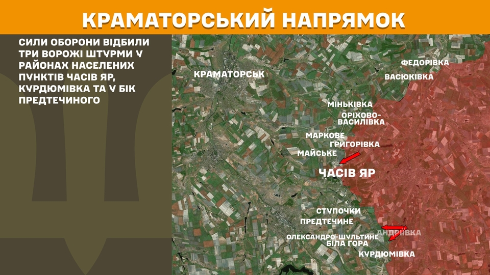 На Краматорському напрямку Сили оборони відбили три ворожі штурми у районах населених пунктів Часів Яр, Курдюмівка та у бік Предтечиного.