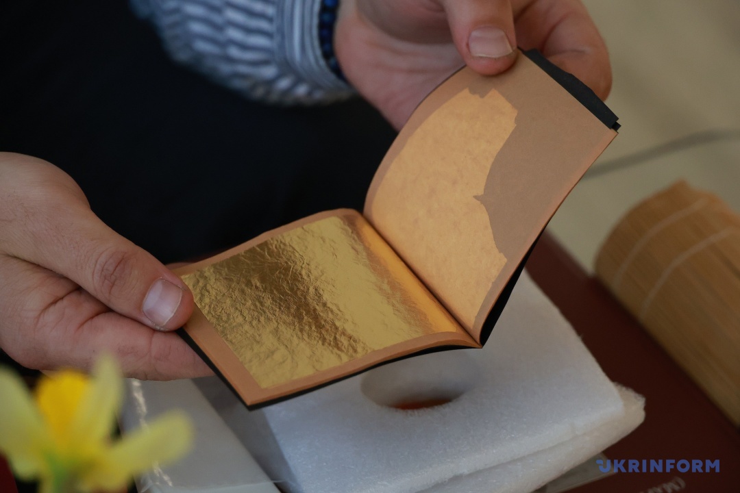 Також Андрій показує нам маленьку книжечку з пластинками сусального золота. У ній – 25 пластинок, ціна «книжечки» – трохи менше ніж дві тисячі гривень. Золотом прикрашають ікону на фінальній стадії. За словами митця, на ікону розміром 30 на 40 см потрібно близько 15 таких пластинок.