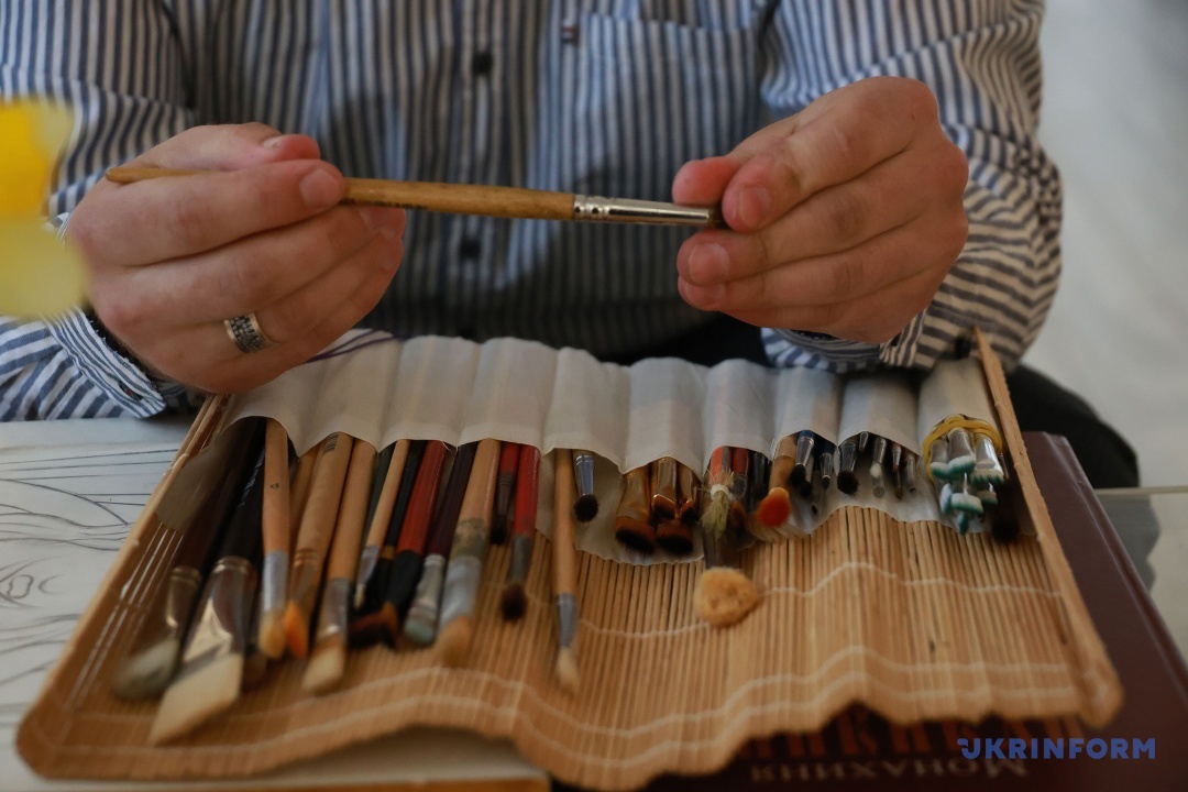Також майстер дивує нас набором своїх пензлів. Каже, найчастіше для іконопису використовує інструменти з хутра білочки. Також пише пензлями з ворсу колонка, поні, кози, свині та навіть кішки.
