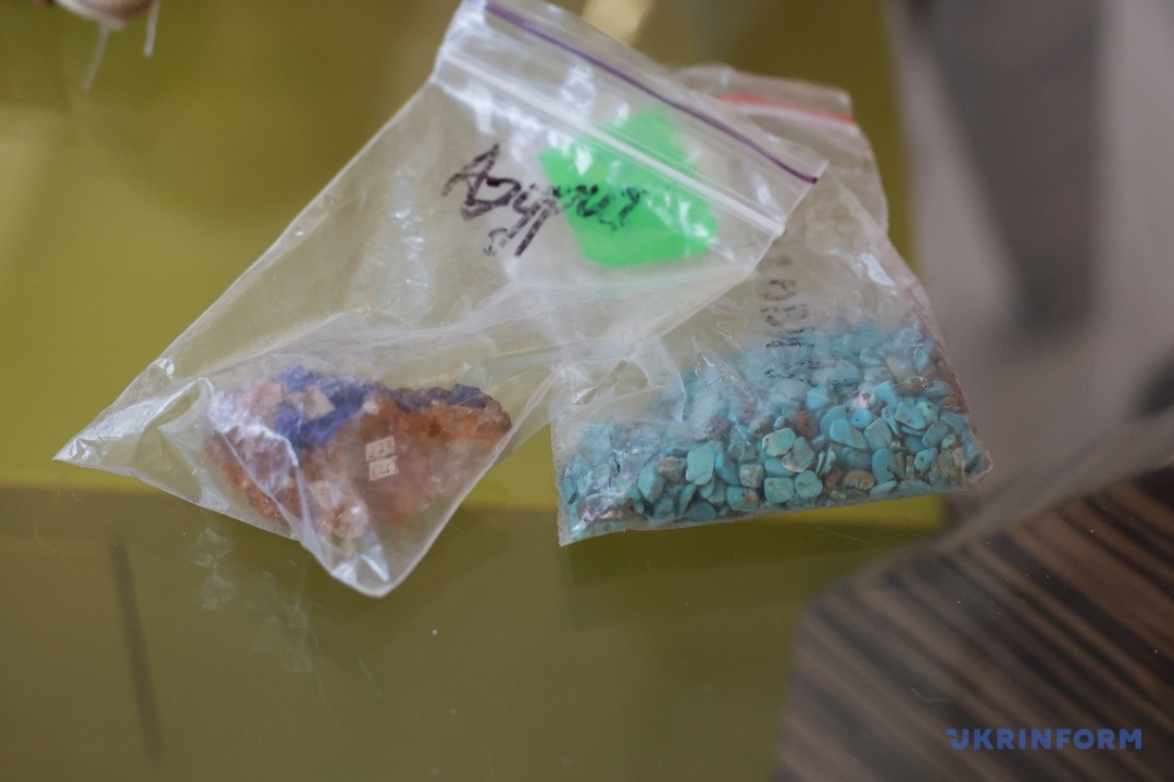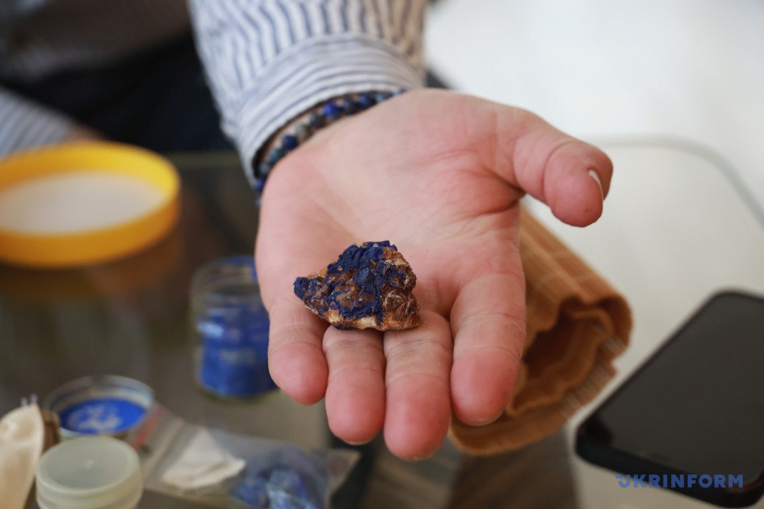 – Ціни дуже різні. У цьому пакетику десь 35 грамів – я взяв за 400 грн. Цей шматочок, тут небагато лазуриту, я взяв за 600 грн. Писати на синтетичних пігментах дешевше, але це інше кольорове звучання, – каже він.