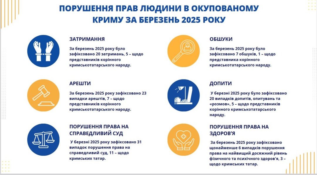 За даними правозахисної організації, також за березень 2025 року відбулося 20 затримань, 5 із них щодо представників корінного кримськотатарського народу; 23 випадки арештів, 7 – щодо представників корінного кримськотатарського народу; 7 обшуків, 1 – щодо представника корінного кримськотатарського народу; 20 допитів, опитувань та «розмов», 5 із них – щодо кримських татар.