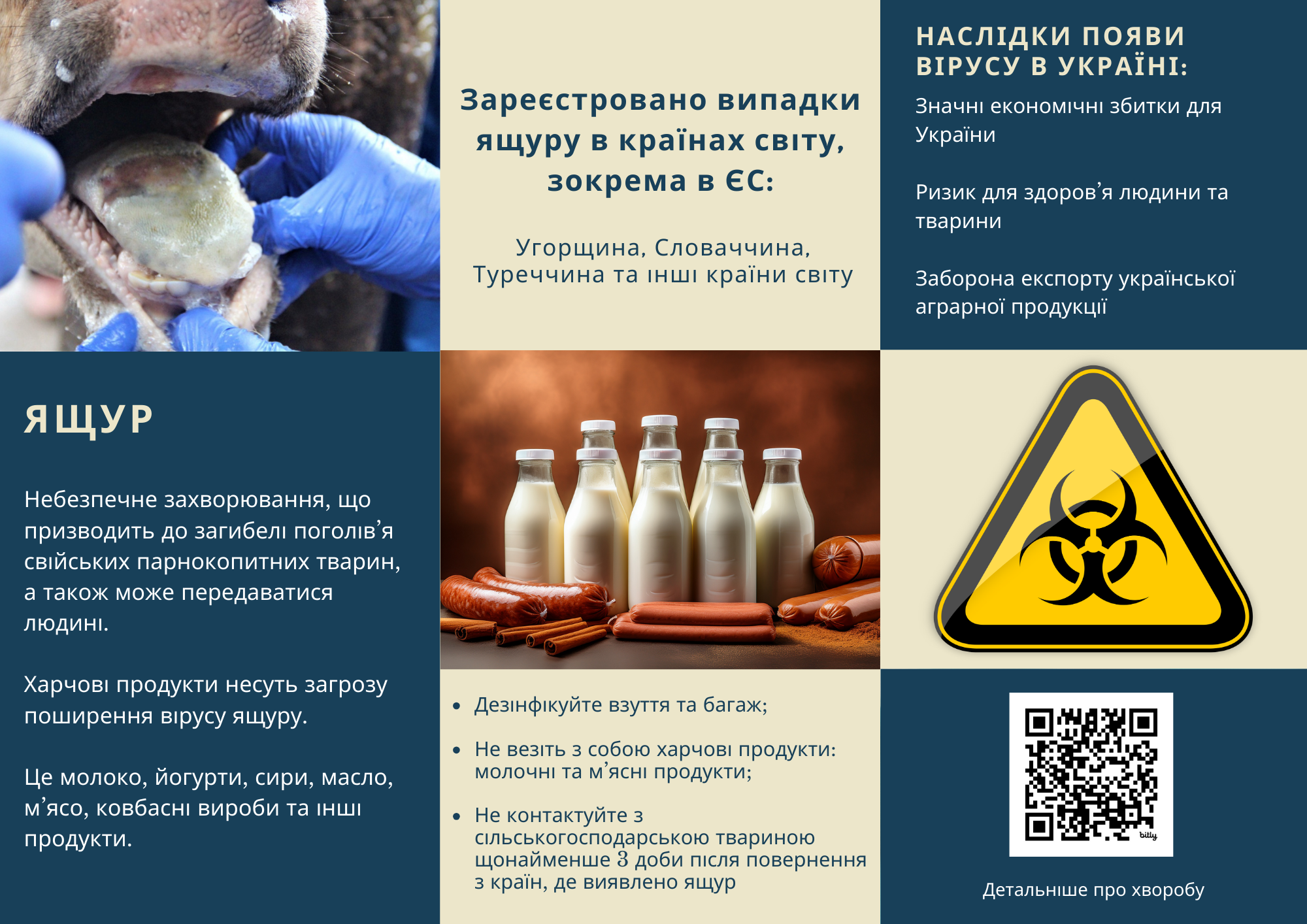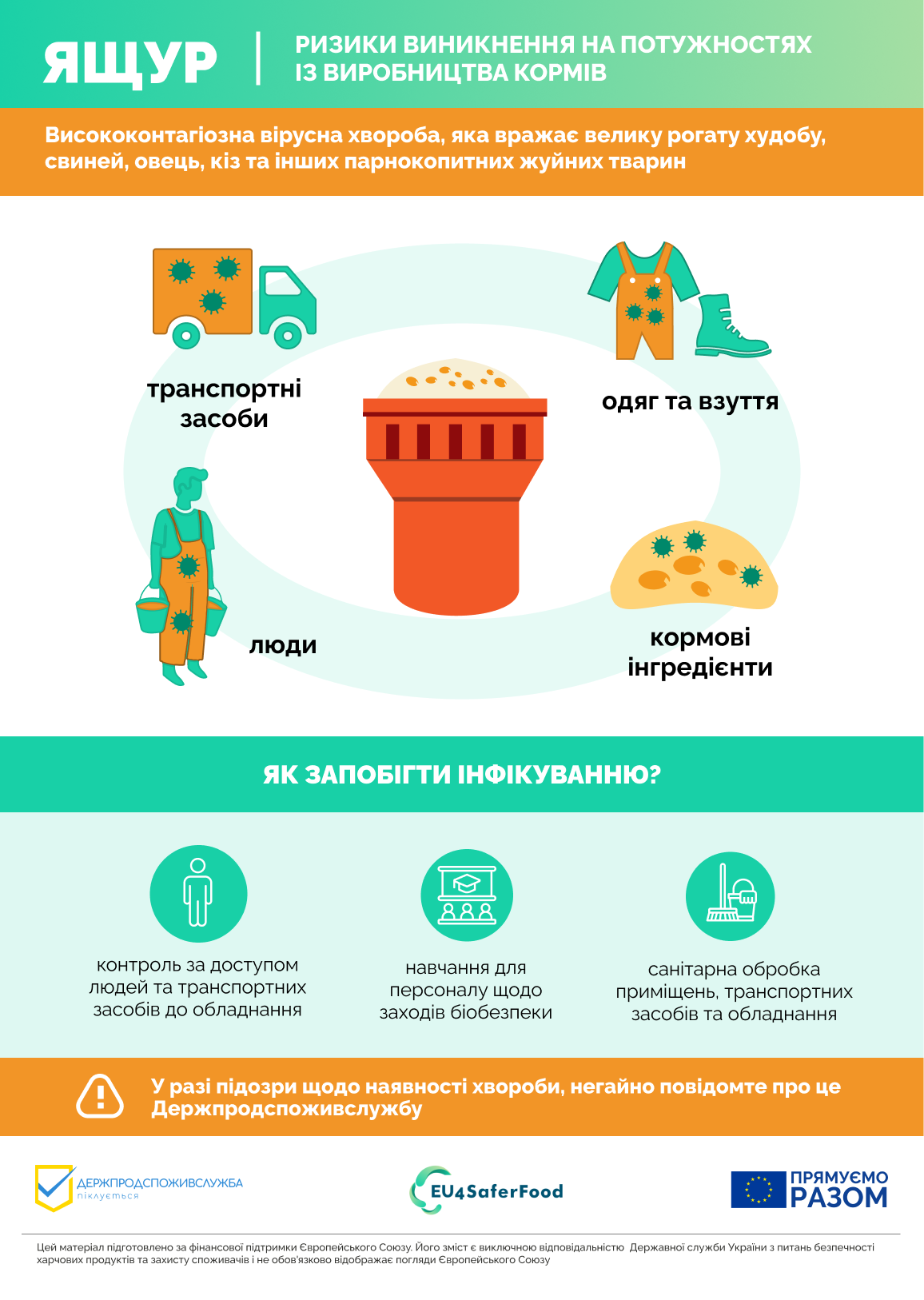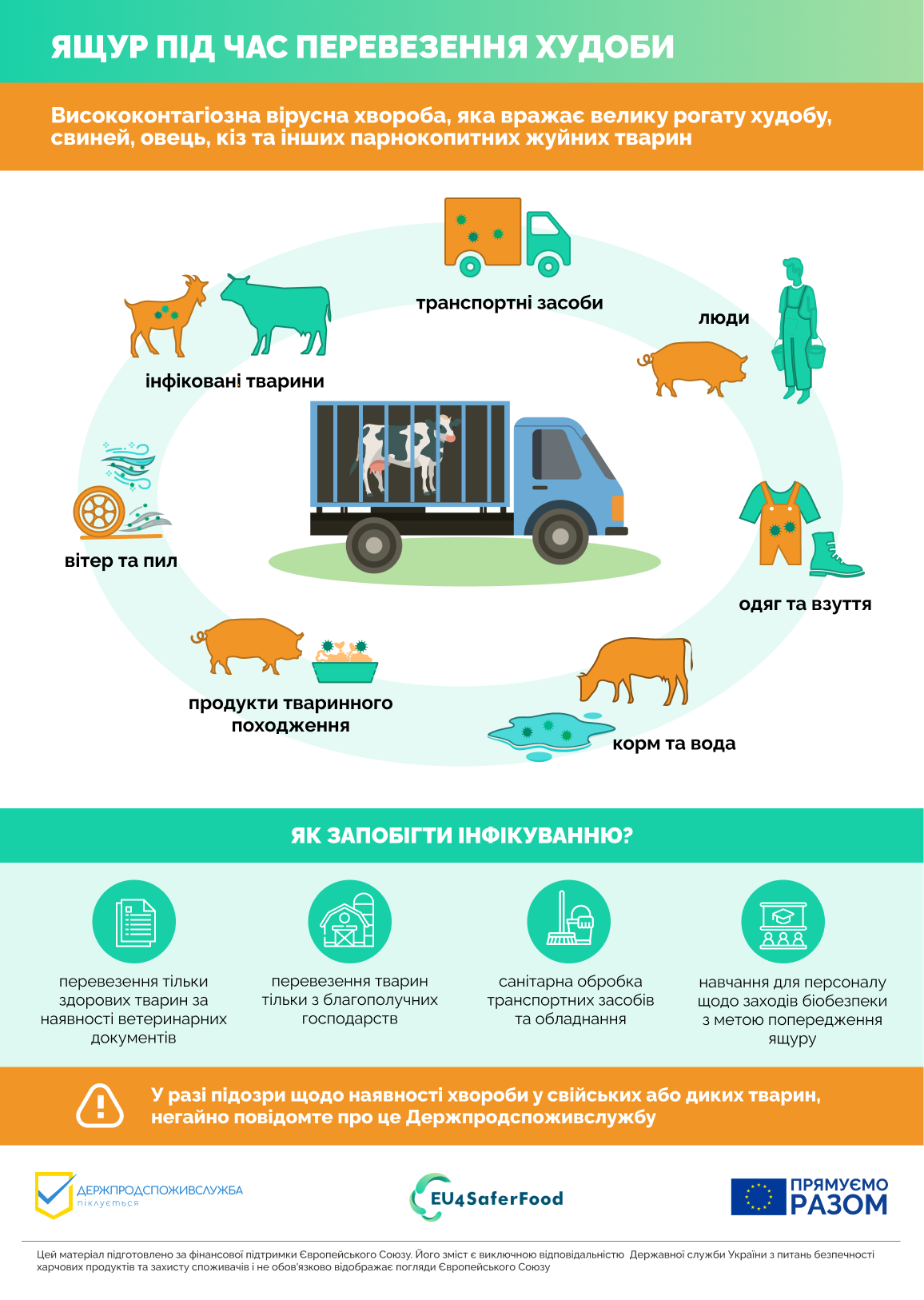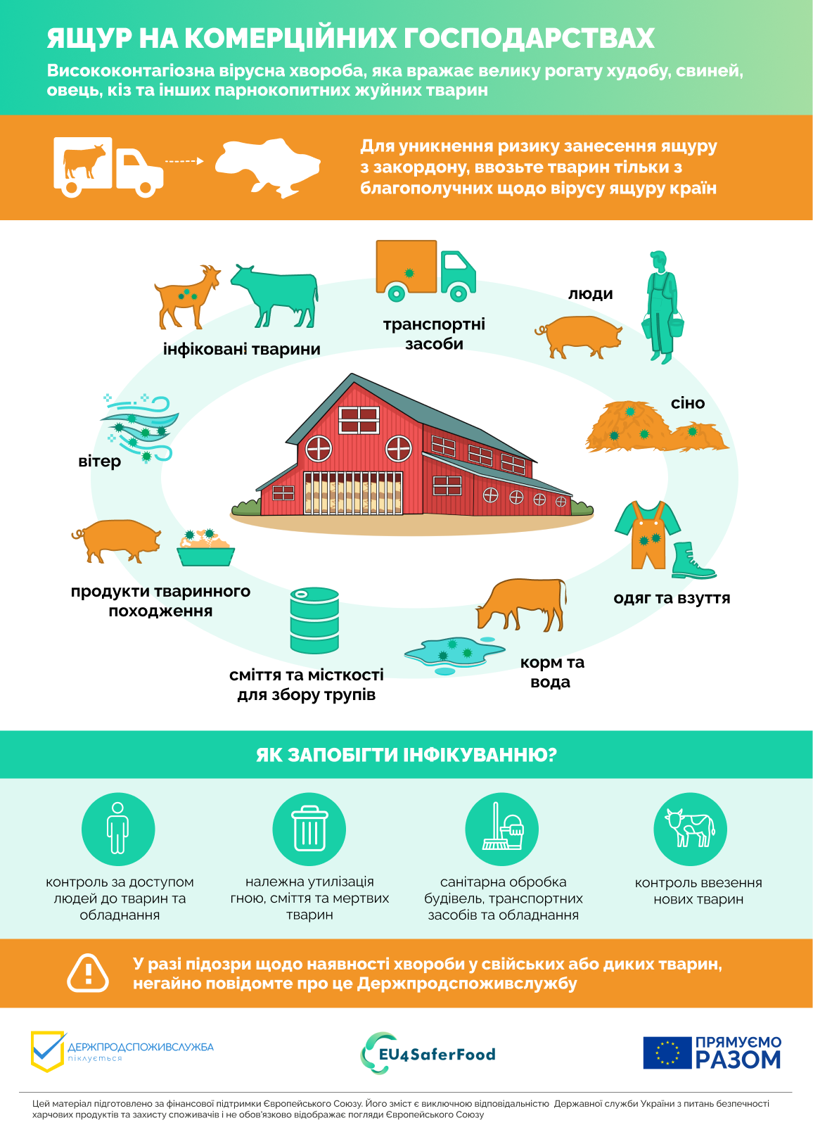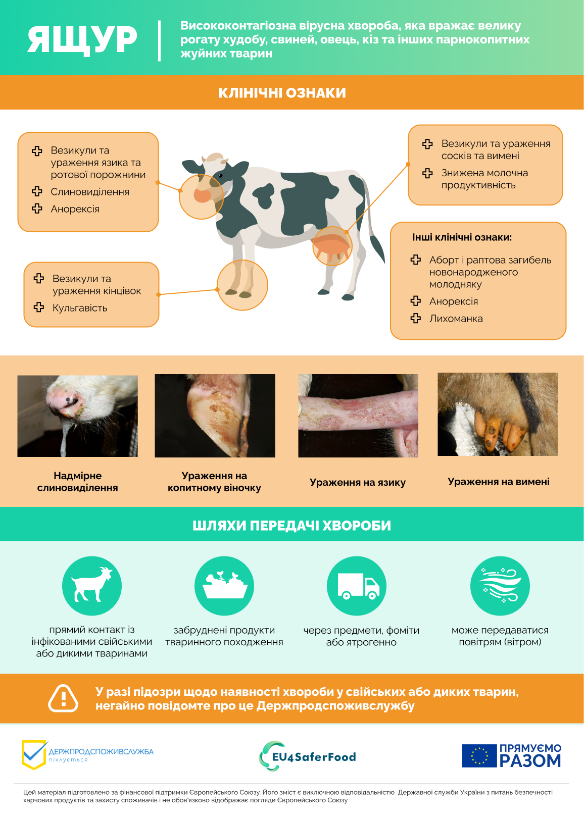 Поінформованість: Ваше стадо може опинитися під загрозою і надзвичайно важливо регулярно оглядати всіх тварин. Про будь-яку підозру на захворювання тварин слід негайно сповістити державного лікаря ветеринарної медицини.
