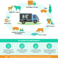 - використання спільних інструментів, транспортних засобів, завозу тварин з різних ферм та персоналу, що мав контакти з тваринами без ретельного знезараження.
