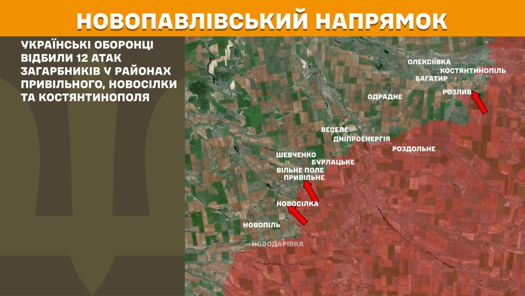 На Новопавлівському напрямку українські оборонці відбили 12 атак загарбників у районах Привільного, Новосілки та Костянтинополя.