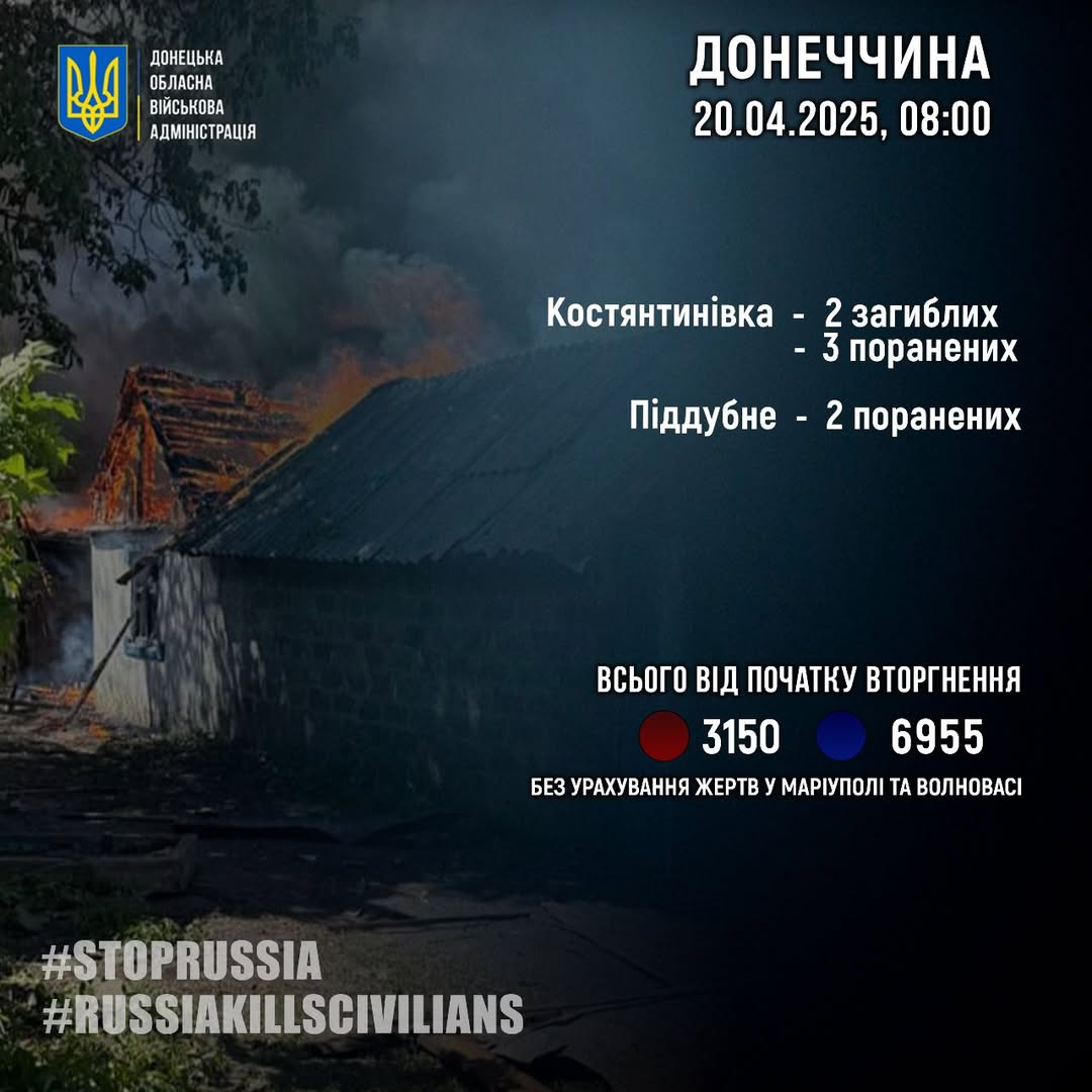 Російські загарбники минулої доби, 19 квітня, вбили двох жителів Донецької області, ще п'ятеро людей зазнали поранень.