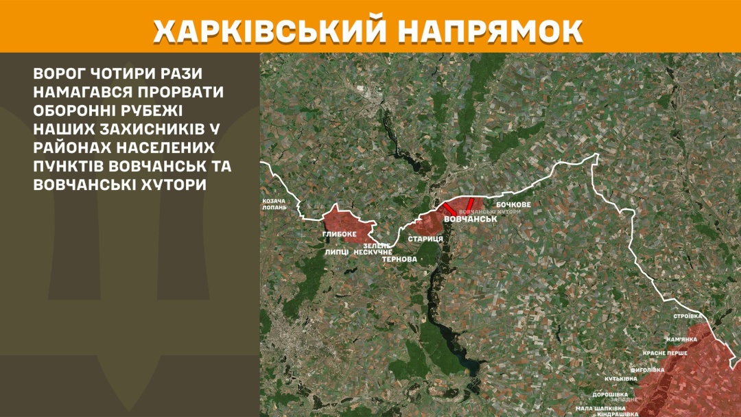 На Харківському напрямку ворог чотири рази намагався прорвати оборонні рубежі українських захисників у районах населених пунктів Вовчанськ та Вовчанські Хутори.