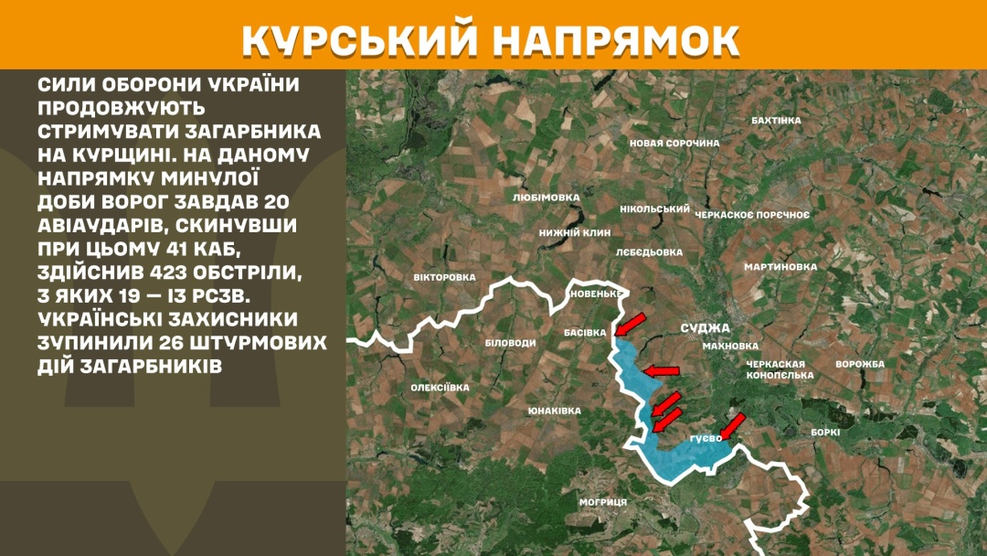 Сили оборони України продовжують стримувати ворога у Курській області. На даному напрямку минулої доби ворог завдав 20 авіаударів, скинувши при цьому 41 КАБ, здійснив 423 обстріли, з яких 19 — із РСЗВ. Українські захисники зупинили 26 штурмових дій загарбників.
