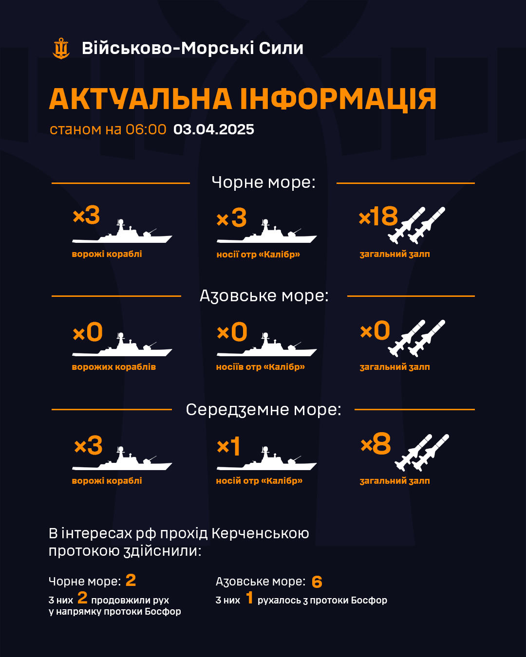 Росія станом на 06:00 суботи, 3 травня, тримає у Чорному морі три військові кораблі, які є носіями крилатих ракет «Калібр», загальним залпом до 18 ракет.
