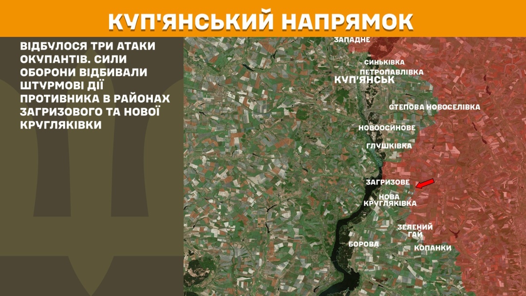 На Куп’янському напрямку сталися три російські атаки. Сили оборони відбивали штурмові дії ворога у районах Загризового та Нової Кругляківки.