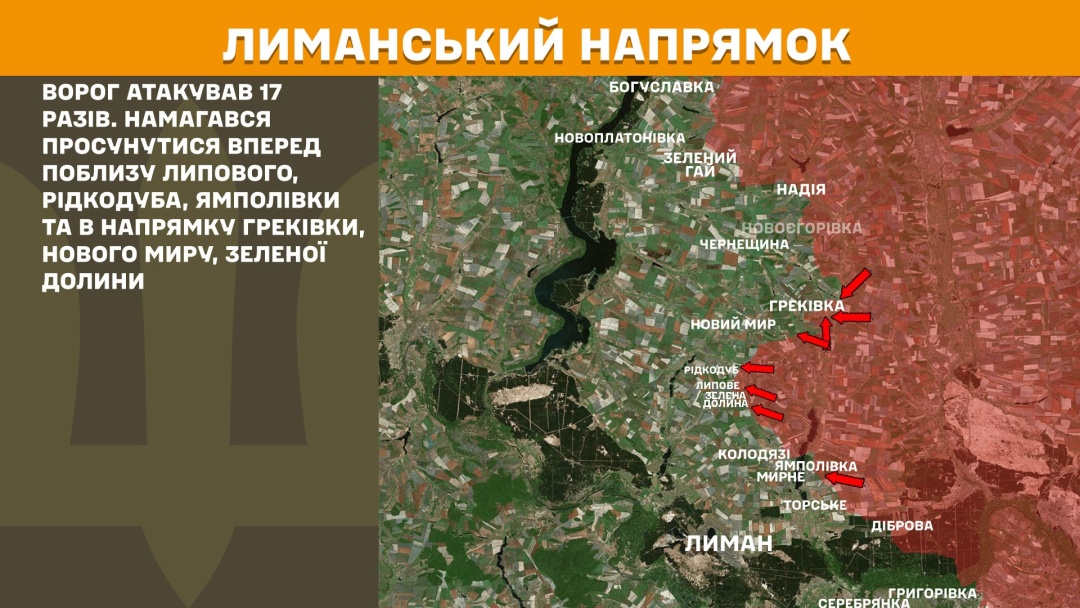 На Лиманському напрямку росіяни атакували 17 разів, намагалися просунутися поблизу Липового, Рідкодуба, Ямполівки та в напрямку Греківки, Нового Миру, Зеленої Долини.
