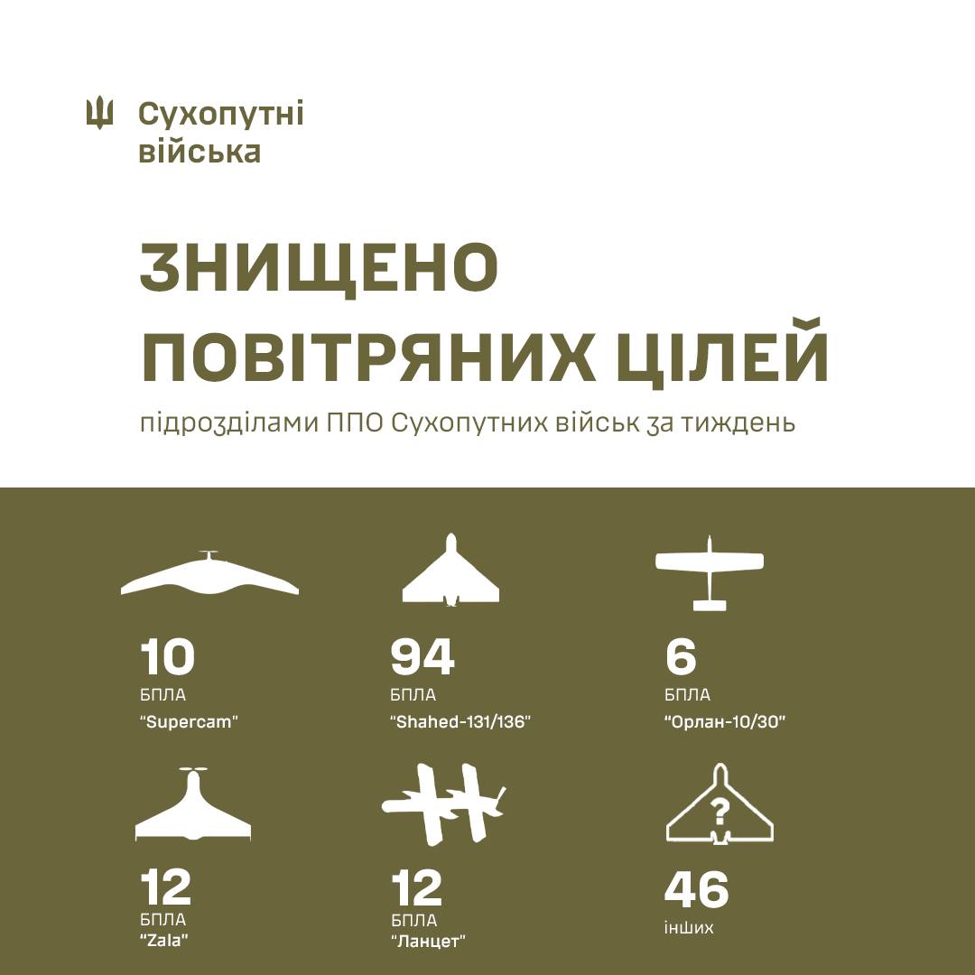 «ППО Сухопутних військ робить значний внесок у захист повітряного простору нашої держави. За минулий тиждень засобами протиповітряної оборони Сухопутних військ знищено 180 одиниць повітряної розвідки та нападу противника, а саме: БпЛА Shahed-131/136 — 94 од.; БпЛА Орлан 10/30 — 6 од.; БпЛА Zala — 12 од.; БпЛА Supercam — 10 од.; БпЛА "Ланцет" — 12 од.; БпЛА "Молнія" — 41 од. БпЛА "Привіт-82" — 5 од.», – йдеться в повідомленні.