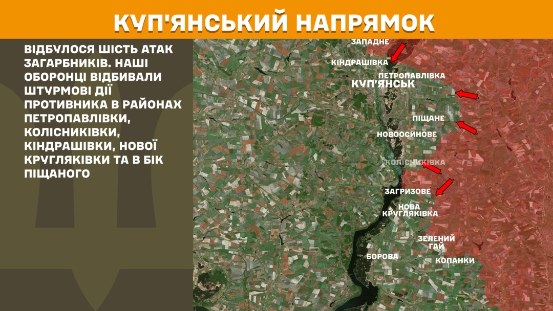 На Куп’янському напрямку сталися шість російських атак. Оборонці України відбивали штурмові дії у районах Петропавлівки, Колісниківки, Кіндрашівки, Нової Кругляківки та в бік Піщаного.