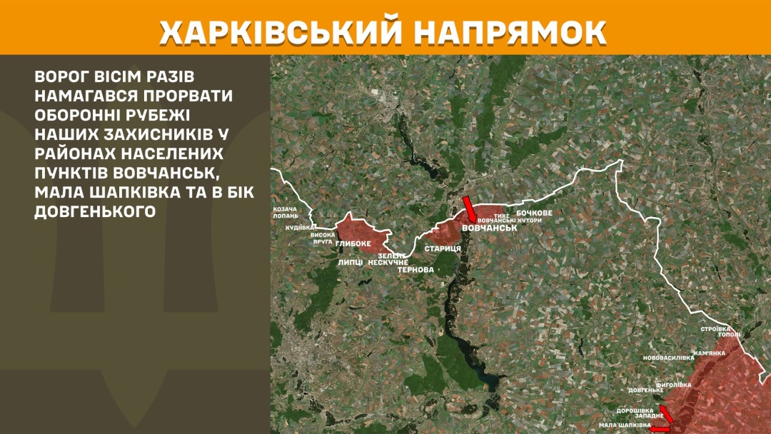 На Харківському напрямку ворог вісім разів намагався прорвати оборонні рубежі у районах Вовчанська, Малої Шапківки та в бік Довгенького.
