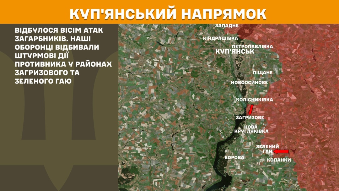 На Куп’янському напрямку вчора відбулося вісім атак загарбників. Наші оборонці відбивали штурмові дії противника у районах Загризового та Зеленого Гаю.