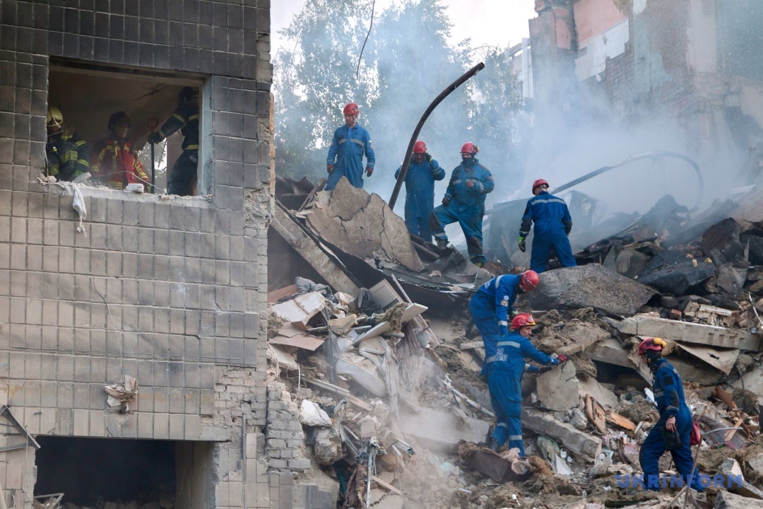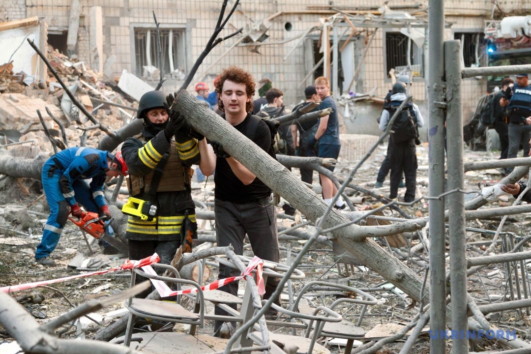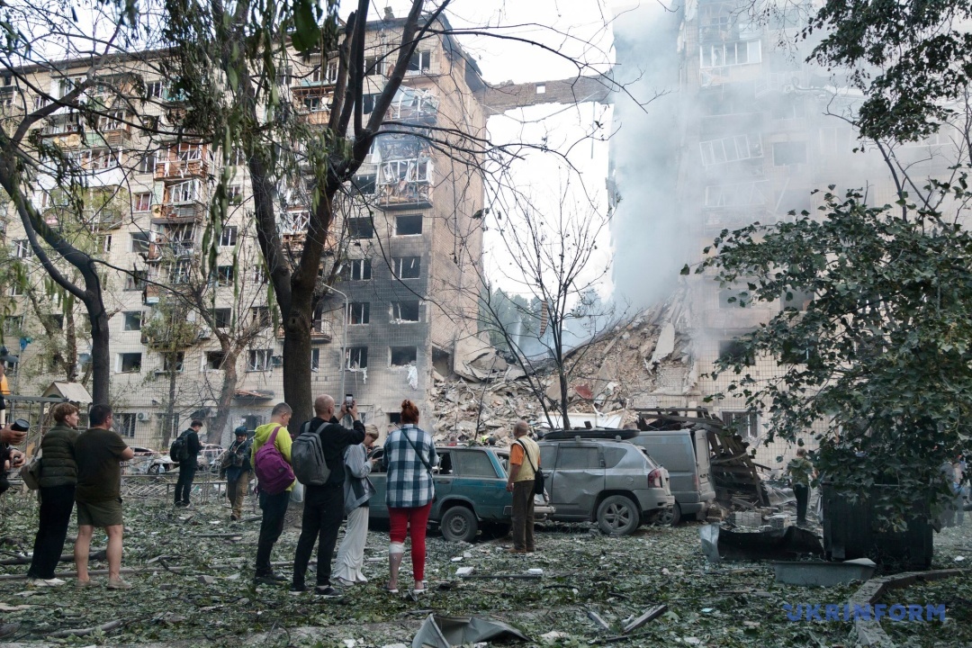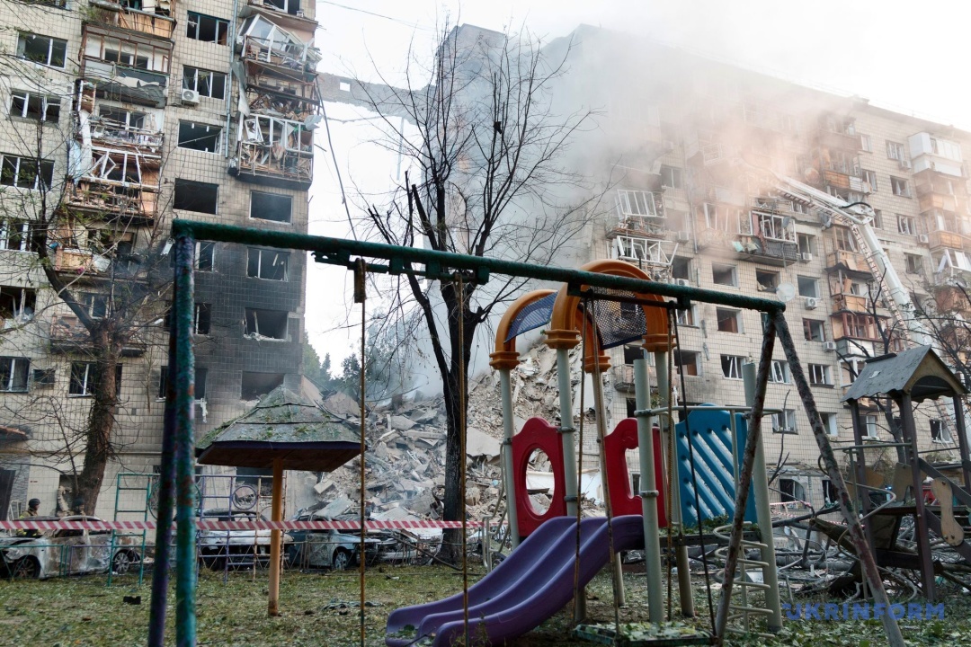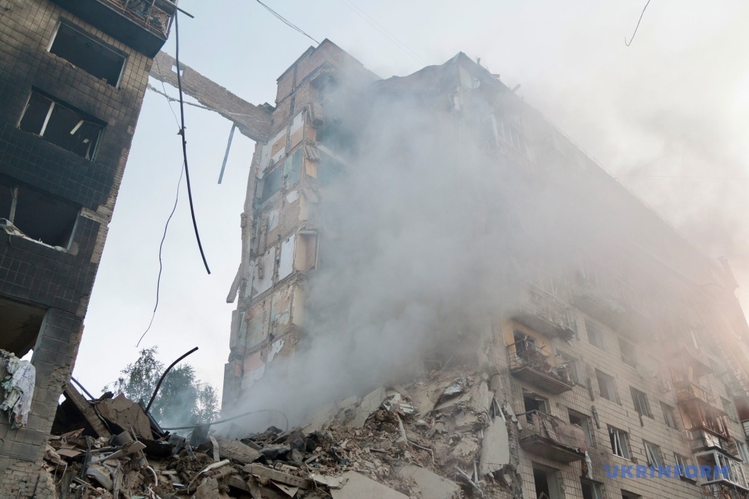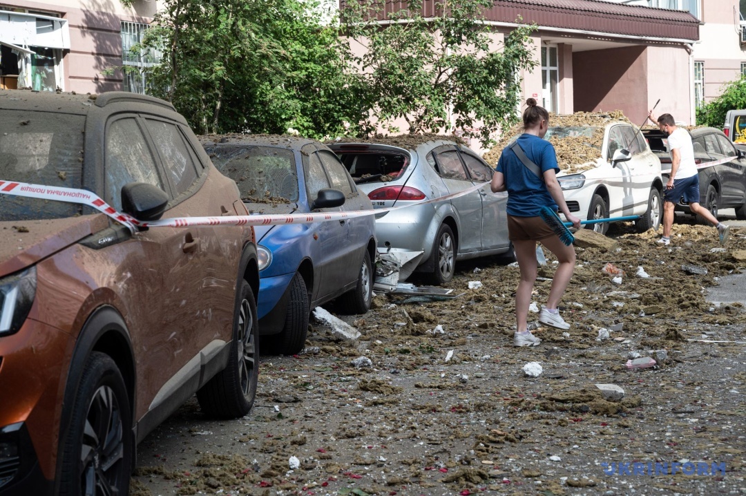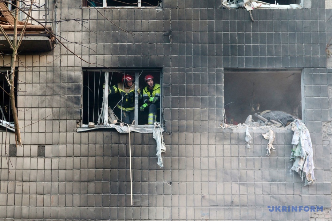 У Солом’янському районі внаслідок влучання ракети у дев’ятиповерхівку повністю зруйновано один під’їзд. Існує загроза обвалення конструкцій. Під завалами можуть перебувати люди. Знищено 8 авто, ще 4 горіли у дворі.