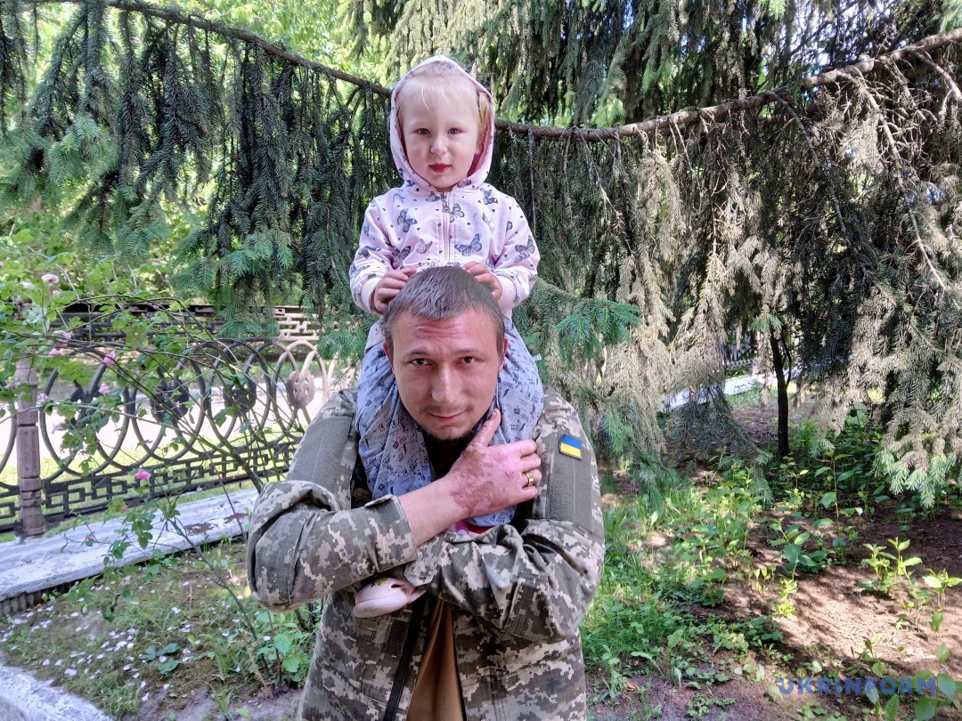 Поки знайомлюся з її батьками – Владиславом та Наталією Петренками з Любарської громади Житомирської області, малеча бігає довкола нас. У якийсь момент тато з усмішкою каже: «Дарино, якщо не будеш слухатися, відправлю до свого комбата. Він тебе навчить дисципліни». Потім бере доньку на плечі, вона ніжно гладить його волосся.